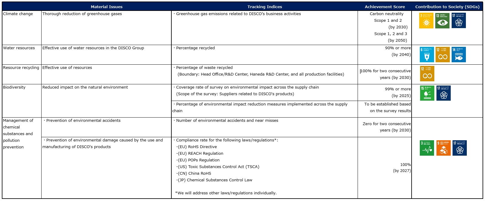Items from DISCO VISION 2030 have been incorporated into the Material Issues, and are indicated as shown below along with the achievement scores to be achieved by the end of FY 2030.