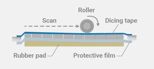DDS2030 achieves high-throughput separation of wafers where a modified layer has been created inside the wafer using the Stealth Dicing™ process. Unlike the existing method, which requires breaking each line individually, DDS2030 uses a roller-scanning method to separate ultra-small die that cannot be singulated by tape expansion alone, realizing both high productivity and high quality.